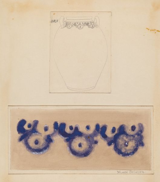 Editor: This watercolor drawing is titled "Crock," made around 1937 by Janet Riza. The layout is quite unusual. I am struck by how the relatively plain depiction of the crock is juxtaposed with a second, more ornate illustration of flying birds. How would you interpret this choice, putting it in historical context? Curator: It is fascinating, isn't it? Consider the era – the late 1930s, deep in the Depression. We might view this work through the lens of economic and social disparities. Riza gives us an interesting binary of the everyday—the crock—with idealized images such as eagles. What does that contrast mean in terms of aspirational imagery versus reality? The birds appear on what looks like a decorative panel, almost as if on mass-produced items... Editor: I see that now. There is something almost "stamped" about them, lacking true originality, or real aspiration. It appears like it could be on packaging. Curator: Exactly. This brings forth themes of commodification and the contrast between handcrafted objects—perhaps represented by the crock—and the increasing dominance of mass-produced goods, and the imagery used to sell them. How can we relate this to contemporary debates surrounding consumerism and the authenticity of experience? Editor: That’s a great point! I hadn't considered how mass production and design would play into it. The crock stands apart because it is a plain object. Curator: And what does that plainness represent in a world increasingly driven by visual excess? Perhaps it speaks to sustainability, functionality, the “make do and mend” ethos prevalent in that time? Riza encourages us to consider the values embedded within everyday objects versus those projected onto us by consumer culture. It pushes us to ask: Who is profiting from that disparity, and at whose expense? Editor: I see now. This plain container isn't simply that; it embodies those themes of social commentary. Thanks so much. Curator: The pleasure was all mine.