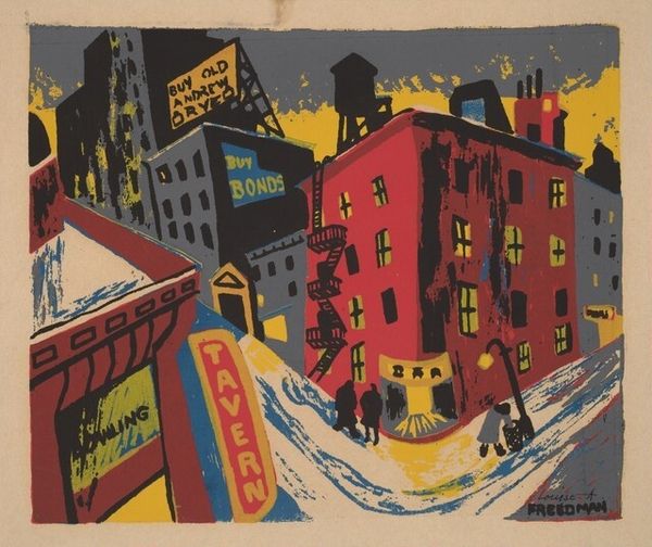 Curator: William H. Johnson's "Harlem Street Scene with Full Moon," created around 1940 using oil paint, offers us a vibrant glimpse into urban life during the Harlem Renaissance. Editor: My initial impression is a childlike wonder, perhaps even a deliberate naiveté. The buildings are boxy, the moon an almost comically large yellow disc. There’s a flattened perspective that simplifies the scene, yet it still manages to evoke a distinctive atmosphere. Curator: That deliberate naiveté, I believe, is Johnson’s way of engaging with the modernist primitivism movement, but always through the lens of his own cultural experiences. The Harlem Renaissance was about reclaiming and celebrating Black identity. How does Johnson contribute to that dialogue here, in your opinion? Editor: The stark color palette and simplified forms—browns, yellows, and blues—create a powerful visual impact, evoking both warmth and a sense of stark urban reality. It’s less about detail and more about emotional resonance. The exaggeration creates a sense of almost fairytale world. The oversized moon presiding over everything… it lends the piece an interesting spiritual or magical dimension. Curator: Yes, exactly. And, if we think of Harlem at this period as the 'Black Mecca', then maybe the yellow moon is there to remind people that Harlem was a beacon, shining like a big yellow moon in the night sky, attracting and illuminating a generation of Black creatives and thinkers, providing opportunities, fostering a vibrant community in the face of adversity and systemic racism. And yet this idealized space is presented as a space like any other with its architecture, roads, and lights that serve to further advance modern life. Editor: Looking closely at the composition, the road leads our eye into the distance. I love how Johnson used the strong verticals of the buildings and streetlights against the curves of the road to lead the eye up to that celestial body that you talk about. Curator: Understanding the social and political backdrop of Harlem in the 1940s enriches the piece immeasurably, though, don’t you think? This wasn't simply an artistic expression; it was a statement. Johnson gives the public a means to imagine a space so fundamental to understanding the history of race. Editor: Definitely, that historical weight is present even if the presentation feels lighthearted. The simplified visual vocabulary emphasizes the feeling and emotional intensity. I’ll think differently about how I perceive paintings like this one from now on. Curator: I concur. Understanding how social contexts influence even the seemingly simplest composition changes how we interpret and give worth to art. Thank you.