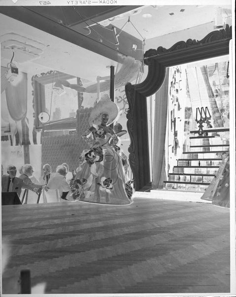 Editor: This is an untitled photograph by Jack Gould, depicting a girl sitting on a bed, completely surrounded by banners and signs. It feels like a snapshot of teenage life, but I'm struggling to understand what's being communicated. What do you see in this piece? Curator: It's fascinating how Gould captures the performative aspect of adolescence. The girl is literally framed by symbols of her identity – team banners, school events, even a campaign sign. It speaks to how teenagers actively construct and curate their public image, even within the private space of their bedroom. Editor: So, the bedroom becomes another stage? Curator: Precisely. And notice how the photograph itself, its very composition, participates in that construction. It’s not simply documenting reality, it's contributing to the narrative. What do you make of the inverted negative? Editor: It gives it an eerie, almost dreamlike quality, like a memory. I never thought about the performative nature of teenage life in quite this way. Curator: Photography, especially within the realm of portraiture, has always been deeply intertwined with identity and its presentation. This piece cleverly layers those complexities.