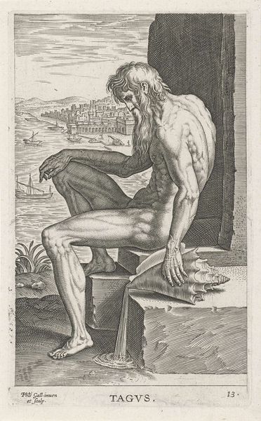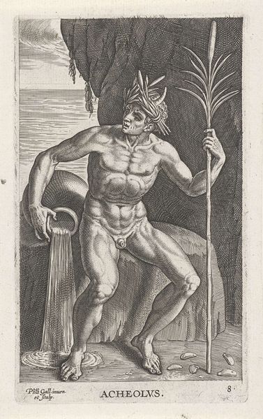 Philips Galle produced this engraving of Zeegod Oceanus in the late 16th century. Galle lived during a time of expanding global trade and exploration, which influenced the cultural imagination. Representations of mythological figures like Oceanus reflected the period's fascination with the seas. The engraving presents a muscular, nude male figure riding a dolphin-like creature. The depiction of Oceanus embodies ideals of masculinity valued in European art at the time, emphasizing strength and virility. However, this idealization also obscures the diverse realities of those who lived and worked by the sea, particularly indigenous populations affected by maritime expansion. Galle's image participates in a long history of representing the ocean as a domain of white, male power, overlooking the labor and experiences of women, people of color, and enslaved individuals whose lives were deeply intertwined with the sea. Consider how historical narratives and societal structures influence the ways we perceive and portray mythological figures. This engraving prompts us to reflect on whose stories are amplified and whose are marginalized in the grand narratives of history.