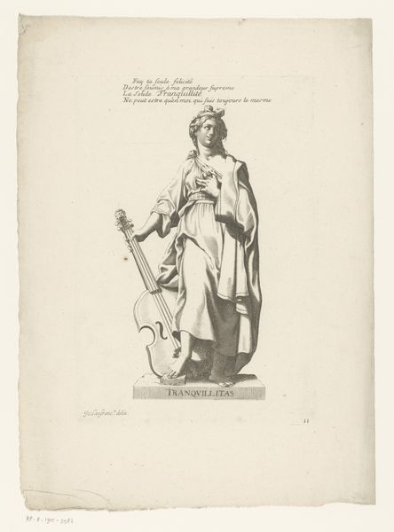 Editor: This engraving, "The Prophet Haggai" by Francesco Rosselli, dating back to the late 15th century, is quite striking. There's a stillness and pensiveness to the figure. How do you interpret this work, given the context of the Italian Renaissance? Curator: The image resonates with layered symbolism, doesn't it? Consider Haggai himself. Here, he’s portrayed not merely as a historical figure but as a vessel. The book he holds open is an attribute, suggesting both revealed wisdom and the interpretation thereof, integral to the humanist project. Do you notice anything about his clothing? Editor: Yes, he is ornately dressed, wearing a crown. He does not look like what I think of as a humble prophet. Curator: Precisely! The crown is a visual cue. Think about how clothing acts as an archive. A symbol, like clothing, speaks of rank and influence. What memory is Rosselli trying to activate in the viewer? Consider that Renaissance art was steeped in a rediscovery of classical ideals and biblical narratives. Editor: So the clothing represents temporal power as well as divine insight, all within that Renaissance framework of reinterpreting the past? Curator: Precisely. Haggai is rendered both learned sage and authoritative figure. The symbols coalesce, directing us towards a contemplation of wisdom, power, and the intertwined nature of spiritual and earthly authority. What might the text at the bottom of the engraving add? Editor: The text might serve to reinforce his prophecies. Thank you, I am beginning to understand how much detail went into every facet of this engraving to signal Haggai's complex identity! Curator: Indeed. It underscores how symbols construct narratives, shaping our understanding of historical and spiritual figures. Every detail is intentionally deployed.