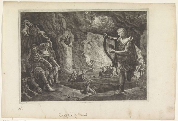Editor: Here we have Johannes Vorsterman's etching, "Allegory of the Path of True Love," created in 1661. The detail is amazing, but it also feels… ominous. There are figures lurking in a dark forest. What can you tell me about it? Curator: This etching speaks volumes about the 17th-century Dutch perspective on love and relationships. The “path of true love” wasn’t necessarily straightforward; it was often fraught with societal expectations, moral choices and the ever-present gaze of the community. Editor: So, the forest represents challenges? Curator: Precisely! And note how the artist contrasts the darkness below with the idyllic scene in the upper right corner, seemingly depicting the ultimate goal of marriage and family. This contrast forces us to ask: What obstacles did one face in 17th century Netherlands? Marriage was heavily influenced by social status, wealth and family connections. Love was only part of the equation. Editor: I see. What about the older man with the lantern at the bottom? He seems important. Curator: The old man likely represents wisdom or perhaps societal guidance, but consider that he also carries a lantern. He sheds light, but only illuminates so much. Who controls that narrative? Vorsterman invites the viewer to consider the limitations of societal norms and institutions. It asks us if societal guidance helps navigate this journey, or rather restricts true feelings in relationships? Editor: So, is Vorsterman being critical? Curator: Perhaps not explicitly critical, but he's definitely prompting us to question the established norms. How love was constructed, perceived and regulated at the time. That’s the role of art in the public sphere, after all. Editor: I never thought about approaching it that way. Thank you for pointing out those subtle yet powerful ways Vorsterman communicates the nuances of "true love." Curator: My pleasure. Considering the artwork's place in a network of socio-cultural meanings always enhances one’s viewing experience.