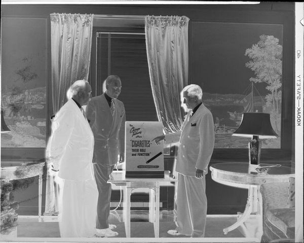 Editor: Here we have an "Untitled (three men with film projector)" print by Peter James Studio. Given the stark contrast of the negative, the composition feels quite dramatic. What can you tell me about its formal elements? Curator: The photographic negative offers an intriguing study in light and shadow. Note the distribution of tonal values: the darker foreground figures against the lighter background. It creates a spatial depth and emphasizes the texture of the subjects' clothing. How does this manipulation of light affect your interpretation? Editor: I think it makes the figures look almost ghostly. Do you think that was the intent? Curator: It is difficult to say without knowing the artist’s intentions, but the formal qualities are undeniably powerful. The arrangement of figures and equipment also establishes a compelling visual rhythm.