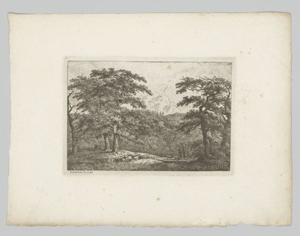 Curator: We're now looking at "Landschap," a print by Paulus Lauters, created around 1829. It's currently held here at the Rijksmuseum. Editor: My initial impression is one of tranquility tinged with melancholy. The monochromatic palette emphasizes a quiet, almost somber mood. Curator: Absolutely. Consider this work within the Romanticism movement. The landscapes weren't just about depicting nature, but conveying feelings, ideas, and especially the relationship between humanity and nature. Editor: That solitary tree dominating the scene... to me, it evokes the Tree of Life or Knowledge. It feels like it's watching, bearing witness to time and perhaps the passage of civilization itself. Are the figures resting there, perhaps contemplating something profound? Curator: The human figures are tiny compared to the grandness of the landscape, illustrating humankind’s insignificance. We can contextualize this against the backdrop of rapid industrialization—a yearning for an idealized past before progress irreversibly altered nature. Editor: The stark contrast in tone emphasizes a distinct symbolism, that's clear. Perhaps the lighter areas are representations of clarity and the hope that spring can provide? Curator: I interpret the highlights and shadows more politically; highlighting imbalances in nature or life; but this era valued emotion, longing for an impossible idealized time. Consider the engraving itself. It could have been much brighter or darker to create more hopeful or depressing landscapes. Lauters used grey in almost equal measure, allowing viewers to apply their experiences to interpret it as they like. Editor: True. And looking at Lauters use of Romantic techniques shows a yearning for simplicity in complex, turbulent times. Curator: What strikes me about analyzing the history of it, there are more direct conversations that should be happening, politically, to the subject matter that this piece is depicting, while respecting the landscape. Editor: Precisely. Looking through both symbolic and historical lens broadens our perspectives.