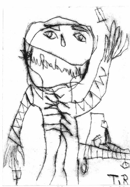 Thomas Riesner made this small ink drawing, IMAGE:23, on paper with what seems to be a very simple kind of pen. There's a rawness and immediacy to the marks; it’s all line, no tone, but some of the lines have been drawn over, giving them a shadowy depth. Look at the head, or is it a mask? The lines radiate out from the edge of the face, giving it an almost comical appearance, like a sunburst. But what's really interesting to me is the nose, or maybe it's a beak? It’s this big, blank shape with a vertical line down the middle and these little lines emanating from it, like some sort of strange antenna. The artist seems to be working from memory to represent the emotion he wanted to portray. This kind of quick, expressive drawing reminds me a bit of Picasso's later work, where he was trying to capture the essence of a thing with just a few simple lines. Art is like a visual language, constantly evolving and changing over time.