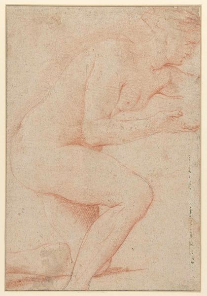 Editor: Here we have Charles-Joseph Natoire's "Female Nude Offering a Platter" from the Harvard Art Museums. It's a red chalk drawing, quite small. I’m struck by the pose – she’s kneeling, presenting something… what do you see in this piece? Curator: It reflects the Rococo era's fascination with classical antiquity, but filtered through a lens of aristocratic desire. How do you interpret the 'offering'? Is it selfless, or does the presentation itself, the nude figure, serve as part of the offering? Editor: That's an interesting point – the figure *is* the offering, in a way. Curator: Exactly. Natoire worked during a time when the French court heavily influenced art, so this could be a commentary on the commodification of the female form within that society. It's not just about beauty, it's about power dynamics. Editor: I never thought about it that way. The drawing seems so simple, but it speaks to complex social structures. Curator: Indeed. Art is never created in a vacuum, and understanding those societal pressures helps us truly appreciate the work.