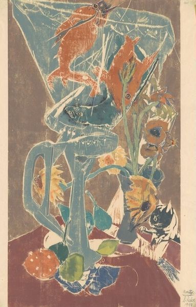 Editor: This is Adja Yunkers’s "Miss Ever-Ready," a 1952 woodcut print on paper. It strikes me as both playful and unsettling. What layers do you see in this piece, beyond the immediately visual? Curator: "Miss Ever-Ready" pulses with a postwar tension. Look closely – does the title, with its suggestion of feminine preparedness, feel ironic given the abstract, almost weaponized form Yunkers gives his subject? Editor: Weaponized how? I see abstract shapes that suggest a female figure. Curator: Exactly. But consider the jagged edges, the stacked forms, the colours themselves. It echoes anxieties around female identity during a time when women were being pushed back into domestic roles after experiencing newfound freedoms in the war. Editor: So, the "ever-ready" hints at a kind of forced, almost militaristic readiness for domesticity? Curator: Precisely. And remember the historical context: Cold War anxieties, the ever-present threat of nuclear annihilation. Is Miss Ever-Ready prepared for anything, or trapped in an impossible role? Editor: I hadn't considered it that way. Now I see the figure almost as a monument, maybe to the unattainable ideal of the 'perfect' woman. Curator: The layering of textures in the printmaking also contributes to that complexity; do you see how he creates visual and social tension by using the printmaking process in this way? What does it create within you as you gaze upon it? Editor: I see now how what seemed abstract on the surface speaks to broader cultural currents about gender, power, and anxiety during the mid-20th century. I now feel some agitation when seeing it, as though it reflects an underlying dis-ease. Curator: Right! Art like this challenges us to see how those tensions continue to resonate. And by thinking about it from different perspectives, as you have done, that resonance enables awareness and conversation.