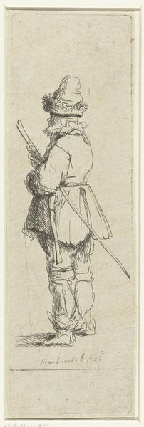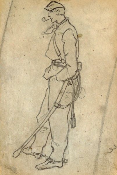 Editor: We are looking at a pencil drawing titled "Man met hoed op en stok onder arm, lopend naar links", which roughly translates to "Man with hat and stick under arm, walking to the left". It’s by Simon Andreas Krausz and made sometime between 1770 and 1825. I'm struck by its simplicity, almost like a fleeting observation. What stands out to you about this piece? Curator: It's interesting how Krausz captures a figure with such minimal detail. Considering the Romanticism movement's focus on the individual, particularly within dramatic historical contexts, one must question the purpose this portrait sketch might serve. Who was this man? And for what function was he drawn? Is it intended as social commentary on class structure or fashion? Editor: I hadn't considered it that deeply. I was focused more on the artistic qualities. Could it have been just a quick study, maybe a preliminary sketch for a larger painting? Curator: Perhaps, but the deliberate signature suggests some level of intended completion or importance. The social and political context is vital here; drawings like these offered accessible avenues for commentary during periods of censorship or upheaval. What details draw your eye beyond the hat and walking stick? Editor: The confident stride suggests a certain level of societal position. Also the clothes; it gives context, even without full detail. It speaks to how people wanted to portray themselves, I guess. Curator: Exactly! Consider also how portraiture evolved with the rise of the middle class and new expectations of individual merit. How might these seemingly minor elements signify broader social trends regarding identity? Editor: I suppose that puts a completely different spin on how I will look at portraiture going forward, beyond the aesthetic. It's almost like a silent language being spoken on class. Curator: Precisely. That’s the beautiful, yet perplexing nature of art! Each sketch whispers tales of larger social forces.