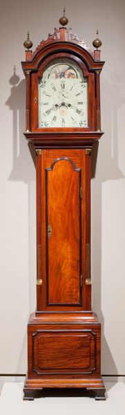 This Tall Case Clock was made by Aaron Willard, a Massachusetts clockmaker born in 1757. It's crafted primarily from mahogany, a prized wood for its rich color and workability, with delicate inlays of lighter woods. Notice the clock's elegant proportions and refined details, from the precisely cut fretwork at the top to the meticulously inlaid panels on the base. Willard and his contemporaries mastered woodworking techniques, elevating furniture making to an art form. The clock’s face and inner mechanism also reflect an increasingly industrialized society. Its form and function speak to the values of precision, order, and the efficient management of time that were becoming central to the rise of capitalism. This beautiful object thus embodies a fascinating intersection of craftsmanship, technology, and the changing social landscape of early America. By attending to all these factors, we can fully appreciate the object's resonance.