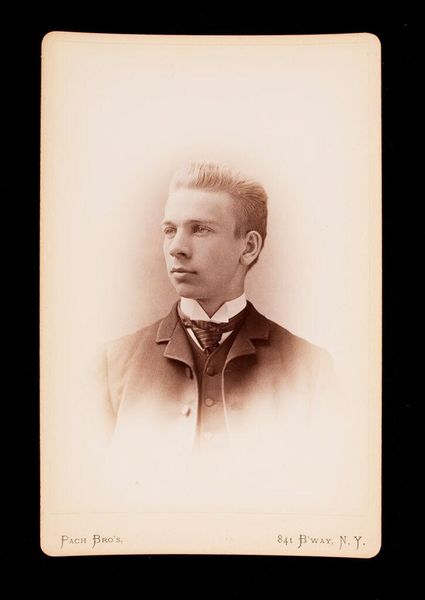 Editor: This is a portrait of an unknown young man, a gelatin silver print made between 1870 and 1885 by Bernhard Hakelier. I’m struck by the formality of his dress—the bow tie and vest—but also the sense of detachment in his eyes. What symbols or deeper meanings do you see embedded within this portrait? Curator: The ambrotype was initially fashionable; a daguerrotype was already an 'old' technique at the time. But what I observe here is how the formality itself becomes a symbol. The young man presents himself in a very particular way, striving perhaps for respectability, or projecting a very public version of himself, not necessarily who he is in the privacy of his home. That little chain or fob can suggest many things: status, membership to a particular club or organisation. Can you tell if that is visible, even? Editor: I see what looks like a pendant hanging at the end, but I cannot quite tell if there is an engraving or a coat of arms. Curator: So the mystery is precisely the point: the power lies in that very obscurity. This "pictorialist" approach gives way to a more psychological, almost dreamlike impression, like you're decoding cultural meanings rather than looking at reality head-on. He embodies that very tension; an individual yearning to define himself within societal expectations. Editor: That tension between individual identity and social expectation makes a lot of sense in this context. Is it something you often see in portraits of this period? Curator: Certainly, and not just in portraits! Artists use dress and certain codes of behavior as cultural shortcuts. Even the photographic methods themselves are imbued with social weight: here it seems a gelatin-silver print to have greater sharpness. Even then this portrait's meaning transcends simply a man from the past, offering us glimpses into ourselves. Editor: That’s fascinating – I hadn’t thought about it that way. It gives me a whole new appreciation for what a portrait like this can convey.