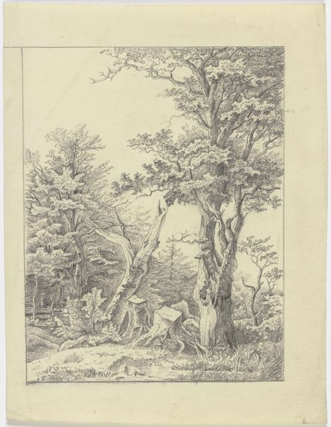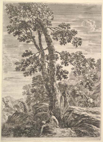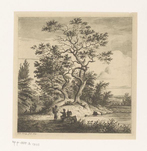 Editor: So this is "Landschap met wandelaar bij water" by Jean Théodore Joseph Linnig, from 1879, made using etching. It has a sort of quiet, contemplative mood. What sociopolitical undercurrents do you see running through it? Curator: It’s interesting you picked up on that quietness. Think about the period – 1879. Industrialization was rapidly changing the landscape and people’s relationship to it. This etching, seemingly just a peaceful scene, could be seen as a subtle act of resistance. How might portraying untouched nature, even in monochrome, serve as a commentary on the societal values of the time? Editor: Resistance, really? I guess I just saw a guy walking through the woods! Are you suggesting it's a critique of industrial society through the lens of romanticizing the pastoral? Curator: Exactly! The figure is dwarfed by the landscape, yes, but that's where you dig deeper into philosophies of the era, especially those that are intertwined with movements interested in land usage. What were anxieties in the late 19th century about humans' place in an increasingly modernized world? The scale of nature can represent both the insignificance of the individual and its value. The question becomes: What statement is the artist trying to make by focusing on landscape and nature? Editor: So, it’s less about the literal image and more about the dialogue it creates with its time. This challenges me to think more deeply about how societal context informs an artwork's meaning! Curator: Precisely. Considering the social and political factors at play helps unveil its complexities. Now, when you look at it, how do your feelings change? Editor: Now I notice both the peace, and maybe, just maybe, an intentional protest of that peace being broken. Thanks for expanding my understanding of historical narratives of art!