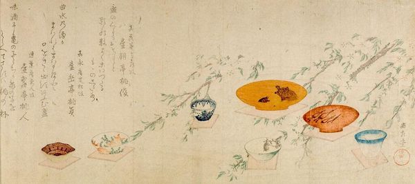 Editor: Here we have Hokusai's "Two Women and Small Child Catching Goldfish." It seems like a peaceful scene, yet there's something slightly unsettling about the women's focused activity. What do you see in this piece? Curator: The image is fascinating when we consider the Edo period's social structures. Hokusai often depicted everyday life, but even mundane activities, like catching goldfish, could reflect societal norms and class distinctions. What role do you think leisure played in public imagery at the time? Editor: I guess I hadn't considered the possible social commentary. It's interesting how a seemingly simple activity can carry so much cultural weight. Curator: Precisely! Hokusai's art often serves as a window into the socio-political landscape, prompting us to question the narratives embedded within these seemingly ordinary scenes. Editor: Thanks, I'll never look at goldfish the same way again! Curator: Likewise, this has been insightful!