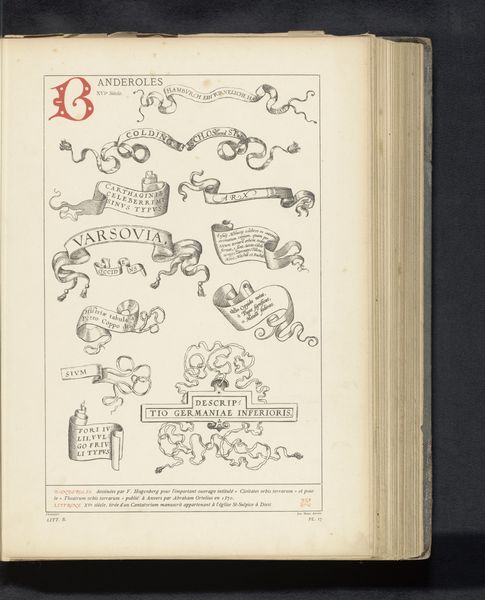This is a reproduction of thirteen banner designs by Frans Hogenberg. It's rendered with precise lines and a keen sense of form. The composition balances the interplay of textual space and decorative flourishes, primarily using a monochrome palette that accentuates the contrast between light and shadow. Each banner presents a study in shape and layout, with carefully inscribed Latin texts nested within curvilinear forms that suggest movement and fluidity. The artist employs a variety of calligraphic styles, from bold capitals to delicate scripts. This demonstrates an understanding of semiotics, where typography becomes a signifier of content and context. The systematic arrangement invites a structuralist reading, categorizing diverse forms that could denote power, region, or allegiance. The designs thus challenge fixed meanings, engaging with new ways of conceptualizing spatial and political representation. The formal clarity of these banners functions not just aesthetically but as part of a larger cultural and philosophical discourse.