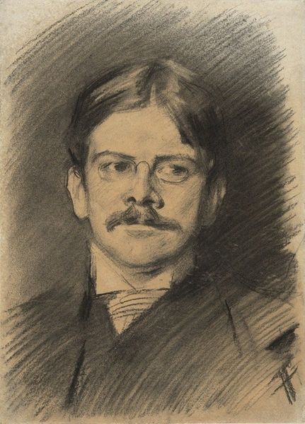 This self-portrait was painted with oil on canvas by Józef Mehoffer in 1897. The artist's face, framed by a pair of glasses, is brought to life through the expressive brushstrokes and the careful rendering of light and shadow. Mehoffer's approach here is indicative of the period, a time when academic training was giving way to more subjective modes of expression. You can almost feel the weight of the paint as it's layered onto the canvas, each stroke building towards a cohesive whole. It speaks to the artist's labor, both physical and intellectual, as he grapples with the challenge of capturing his likeness. The finished painting becomes a testament to the individual hand, and the value of human skill in an age of increasing mechanization. Mehoffer asserts the importance of materials and making in understanding the full meaning of the artwork, which challenges traditional distinctions between fine art and craft.