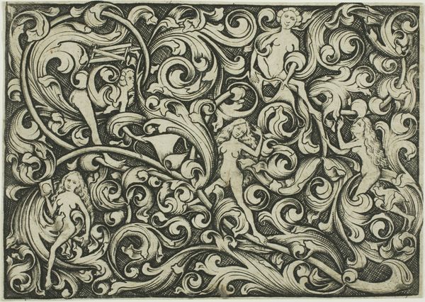 Martin Schongauer etched this ornament with hop vine sometime in the late fifteenth century. The winding hop vine, with its curling leaves and seed cones, fills the composition, intertwining with an almost geometric precision. The hop plant has long been associated with conviviality and brewing. The symbol harks back to ancient rituals, where beer was not merely a beverage but a sacred drink, a social lubricant, and a source of communal bonding. The motif of intertwined vines and leaves appears in various contexts throughout art history. We find it in the borders of illuminated manuscripts, the friezes of Roman temples, and even in the sinuous lines of Art Nouveau. It's a visual language passed down through generations, each era imbuing it with new significance. The continuous, cyclical nature of the vine mirrors life's unending journey. The image stirs deep-seated emotions related to nature, growth, and the cyclical rhythm of life, engaging viewers on a subconscious level.