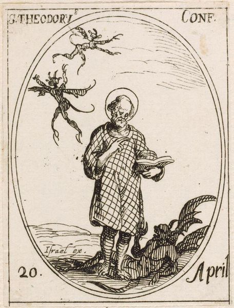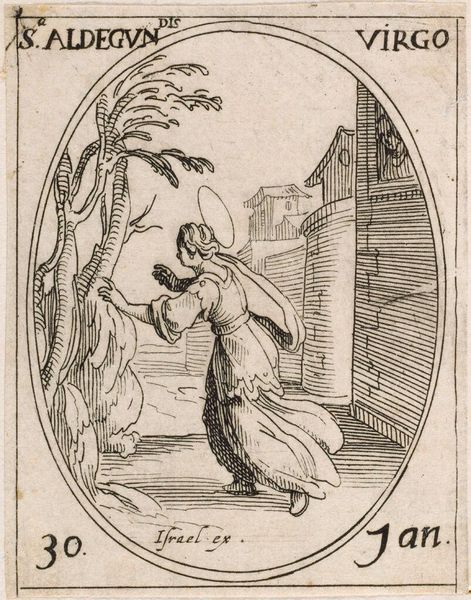 Editor: This is Jacques Callot's "Saint Corona," an engraving. It's quite small, and the scene is... disturbing. She seems to be tied to trees that are bent towards each other, and she's looking up, perhaps in agony. What can you tell me about the context of this image? Curator: Callot created this print, likely as part of a series, during a period of intense religious and political conflict in Europe. Consider how the image may reflect the Counter-Reformation's emphasis on martyrdom and the power of faith amidst persecution. How might this small scale contribute to its dissemination and impact? Editor: So, it's meant to inspire, despite the violent subject matter? Curator: It's likely intended to reinforce faith but also serve as a didactic tool. The print's accessibility allowed for the widespread distribution of this imagery and the stories it depicts. It is quite a powerful image when one considers the socio-political context. Editor: I see now. The small size made it more widely accessible, which is a key point. Thank you.