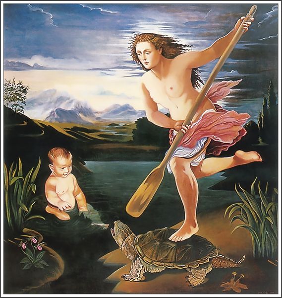 Editor: So this painting, “Garden Hose” by Edith Vonnegut, is really something. I mean, a nude woman is seemingly strangling a tiger with a garden hose, while a baby watches nearby. The juxtaposition of innocence and, well, potential violence, is quite striking. What do you make of it? Curator: It's certainly provocative, isn't it? It strikes me as a powerful commentary on the societal roles imposed upon women. Consider the title, "Garden Hose"—domestic, commonplace. Yet, the artist places this object within a scene of almost mythological struggle. It's the expectation versus the reality of female experience. Editor: So, the garden hose represents the confines of domesticity? Curator: Precisely. And the tiger, perhaps, is the untamed spirit, the rage or passion that society expects women to suppress. The child could represent the next generation inheriting this complex dynamic. Notice the lighting, how it spotlights the struggle and leaves the background almost dreamlike. What impression does that create for you? Editor: It isolates the figures, intensifies the scene, as if this is a performance witnessed by few, yet crucial for everyone involved. A struggle not necessarily lived openly. Do you see echoes of historical artwork, especially considering the poses? Curator: I think the echoes of romanticism, maybe even some art nouveau influence, serve to heighten the sense of drama while making this incredibly uncomfortable scene, something palatable for an art audience. Is Vonnegut forcing us to confront a complex legacy of beauty that contains brutality? Editor: It's a lot to unpack! Seeing it as a social commentary, as a statement about female identity, gives a completely new and deeper context, I now feel. Curator: Indeed. Art at its best sparks dialogue, forcing us to reconsider our own perspectives. And sometimes… what seems bizarre on the surface offers a much richer analysis in retrospect.
