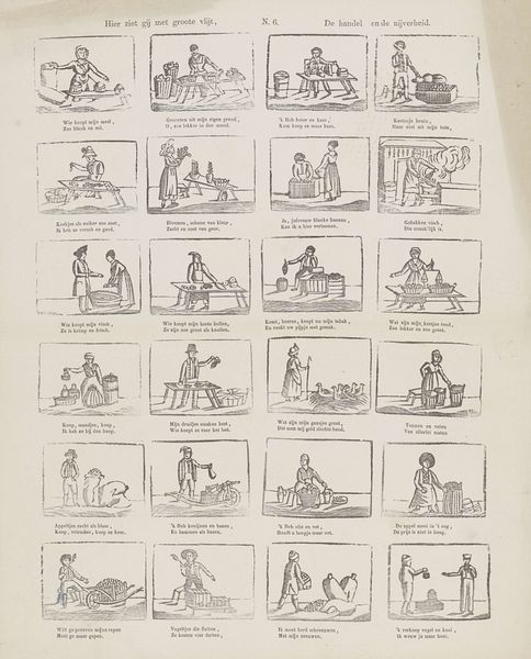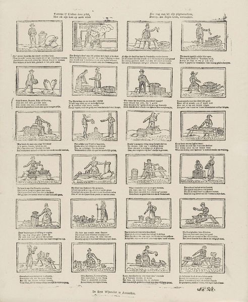 Curator: This woodcut print, created sometime between 1725 and 1780 by Johannes Kannewet, really speaks volumes about social dynamics of the time. Editor: It certainly presents a tableau of interesting, um, characters. Each figure seems trapped in its own little world, its own circular frame. What’s striking to me is the repetitive, almost cartoonish, rendering. How do you interpret this work, especially in relation to the era it was created? Curator: What jumps out at me is how Kannewet is using these almost caricatured figures to critique the prevailing social structures. Notice how the accompanying text points to those who "live gladly on the beggar’s bag," implying a societal dependence and perhaps even exploitation. Think about the role of patronage, and how even a "crippled bishop" has servants – power imbalances are subtly exposed here. What might this tell us about early capitalist systems of dependency and their perceived corruption at the time? Editor: So you're suggesting that these aren't just genre scenes of everyday life but a commentary on wealth and power? I initially saw them more as comical representations of different social types. Curator: Exactly! They are both. This print exists at the intersection of genre painting and social criticism. Consider, too, the positioning of the publisher's information. By placing his name and address at the bottom, Kannewet isn't just signing the work, he's making it accessible, placing himself as a purveyor of social commentary directly into the marketplace. Editor: That is so fascinating to see how art and commerce work together even in 18th century Amsterdam! Thank you for pointing out all those rich layers within such a seemingly simple piece. Curator: Absolutely. It’s in unpacking these layers of history, commerce, and cultural commentary, that we can more fully understand the enduring power of even a humble woodcut.