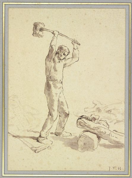 Editor: This is Ferdinand Hodler's "The Wood Chopper," a drawing. The diagonal lines create so much tension in the composition. How do you interpret this work through its visual elements? Curator: Indeed. Note how the figure's posture mirrors the angle of the trees. Hodler's use of parallelism creates a visual echo. Consider the texture achieved through the layering of color pencil, emphasizing the raw physicality of the woodcutter's labor. Editor: So, the form emphasizes the content? Curator: Precisely. The dynamism of the figure is reinforced through the assertive lines and stark contrast. We are left with a sense of forceful movement, perfectly captured in a static image. Editor: It's fascinating how Hodler conveys so much energy through such simple means. Curator: Agreed. By focusing on line, form, and composition, Hodler invites us to contemplate the very essence of physical exertion and its representation within the pictorial space.