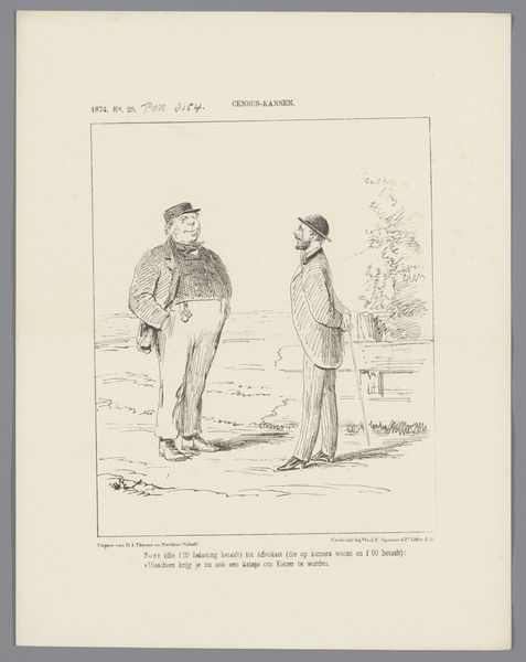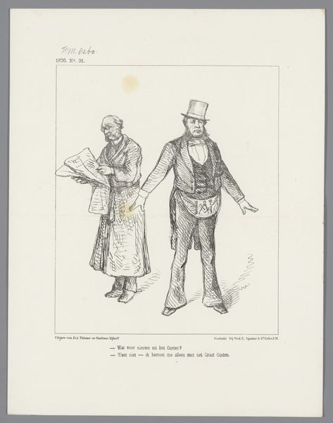 This is a political cartoon by Johan Michaël Schmidt Crans, rendered with ink on paper. Created in 1877, this artwork reflects the turbulent political climate of late 19th-century Europe. The cartoon depicts two figures, one in military attire, engaged in what seems to be a rather grave discussion. The inscription, loosely translated, suggests a sense of shared anxiety as the figure in military attire says 'Mac-Mahon: If you can hold out until October 14, then we might have a chance'. Crans uses satire to explore themes of power, uncertainty, and the fragility of political alliances. It invites us to reflect on how these figures navigate their roles amidst shifting allegiances and power dynamics, and perhaps prompts us to consider our own positions within the broader narratives of society and history.
