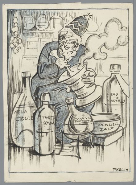 Curator: This is "Dick kijkt naar de etalage van een speelgoedwinkel," or "Dick Looking at a Toy Store Window," a drawing by C. Goes created before 1929. Editor: It's a very direct image. Striking in its simplicity. Just a boy and an array of toys silhouetted against a dark background, really accentuating his desire, perhaps? Curator: Well, drawings like these are really interesting for understanding the social and cultural context of childhood. Look at the types of toys on display: boats, trains, dollhouses. These objects represent the aspirational values of the time – travel, domesticity, and industry. It reveals so much about gender expectations and the perceived roles children were meant to occupy. Editor: Agreed. I'm drawn to the raw materiality of it. You can almost feel the scratching of the pen on paper. And consider the craft itself: using simple ink, probably readily available, to create a scene so evocative. I'm wondering what sort of pen the artist was using? This work emphasizes the means of production, it shows its own making, doesn’t it? Curator: Absolutely, the medium speaks volumes about the context in which it was created, doesn’t it? Beyond the practical limitations, you have to consider Goes’ broader engagement in illustration during a period where mass media and consumer culture were gaining considerable momentum, so it becomes significant where this was displayed or meant to be shown. Editor: Definitely. And I wonder if the apparent roughness serves to amplify its intimate nature; as though you're looking through a personal sketchbook capturing fleeting impressions of city life. Curator: It’s that very personal touch combined with its public implications that give drawings like this real art historical resonance. What seems simple at first holds quite a few complex stories of childhood. Editor: Right, an intimate but insightful work that asks questions about materials and childhood. Curator: Indeed, a window into the past, made accessible through the strokes of ink.