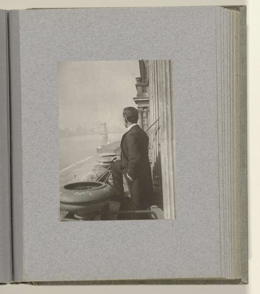 This is a photograph from 1910 of Eugen Wachenheimer on a balcony in Istanbul, its maker remains unknown. Look how soft the image is, the limited tonal range giving it a dreamlike quality. It's less about capturing detail and more about a mood, a feeling. The image is small, but there’s a ton of information packed in. There’s this incredible sense of depth, created by the contrast between the man in the foreground and the architecture behind him. The texture isn’t in the paint, but in the grit of the photographic paper, those imperfections, they’re part of the story, too, aren’t they? Like finding beauty in the imperfect. The dark suit against the pale, almost bleached background emphasizes the figure, giving the man a noble, statuesque air. There’s something of Gerhard Richter's blurred photographs, in the way that this feels both representational and abstract. It’s a reminder that art doesn’t have to be loud to be powerful. Sometimes, it’s in the quiet moments, the subtle gestures, that we find the deepest connections.