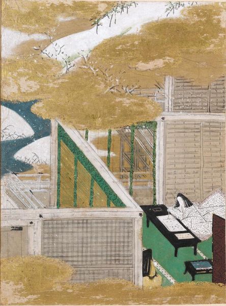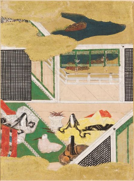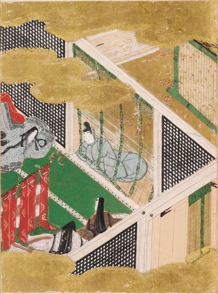 Curator: This is "The Handsome Pillar," an illustration for Chapter 31 of the Tale of Genji, created by Tosa Mitsunobu. I'm immediately struck by the flattened perspective. It feels almost like a stage set. Editor: The mood is wonderfully subdued, though. The limited palette of greens, golds, and reds creates this intimate, almost voyeuristic feel. Curator: Yes, and note how the architectural elements—the screens and pillars—create a framework, segmenting the composition into distinct spaces. Editor: It’s like peering into different rooms of the heart, each holding its secrets. The artist manages to convey the quiet drama of the scene with remarkable restraint. Curator: Indeed. The geometric structures play with the organic flow of the figures, resulting in a balance between order and emotion. Editor: It's a world of subtle gestures and hidden meanings, waiting to be discovered. I feel like the artist gives the viewer some clues, but leaves others to interpretation. Curator: Precisely, it is a thoughtful composition. Editor: Definitely. The entire piece is an intimate revelation.