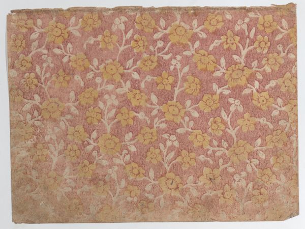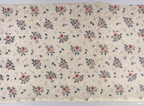 Curator: Here we have a quilt top dating from around 1825. It is currently held here at the Minneapolis Institute of Art. Editor: It feels surprisingly delicate, like a whispered secret. The patterns are so repetitive but the faded pastels give it a soft, dreamlike quality. Curator: Indeed. Consider the laborious process: weaving and dyeing the textiles, piecing together this intricate design. It's a material testament to domestic industry, largely women’s work during that period. This represents not just functional craft, but also artistic expression deeply intertwined with social roles and available resources. Editor: And that’s precisely why its status has long been debated! High art versus craft. The textiles speak of intimacy and utility, created for comfort, but undeniably beautiful. There’s a real dialogue happening between function and form. The use of repeated floral and geometric patterns evokes a sense of the handmade and everyday—pushing back against ideas around fine art elitism. Curator: Absolutely. It reflects a complex intersectionality of identity: gendered labor, societal expectations, resourcefulness, all brought to bear on one piece of cloth. Understanding its placement in this lineage highlights the stories often silenced or dismissed in art historical narratives. Editor: It also brings to light the skill and care inherent in making something beautiful and practical from modest means, and how creativity has long thrived under constraints. There is something incredibly powerful in recognizing that everyday creation can also have profound emotional and historical resonance. It really transcends just 'decoration', wouldn’t you say? Curator: I certainly agree. Thinking about it further, the "organic" elements you mentioned point towards the very grounding in lived experiences. Editor: Right. The work required to bring these material resources together shouldn’t be dismissed either. Curator: A great piece. It leaves one with an enduring perspective on domestic labor. Editor: I have to concur. It leaves one seeing artistry in the everyday.