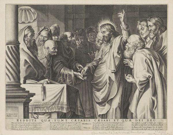 Editor: This print, made between 1664 and 1692 by Cornelis Bloemaert, depicts "The Raising of Tabitha by Saint Peter." The grayscale and dramatic lighting give it a very theatrical feel. What's the first thing that stands out to you? Curator: The arrangement of figures and the contrast of light and shadow speak volumes. Notice how Peter, with his raised hand, is not only the focal point but also a visual echo of authority, almost like a conductor leading an orchestra of emotion. Editor: That’s interesting, because my eye was drawn to the feet of the figure lying on the bed. It seems like a direct invitation for me, the viewer, to come into the scene. Curator: Precisely! Feet often symbolize grounding, a connection to the earthly realm. But here, lifeless and exposed, they highlight the disruption of that connection. What do you think that implies in relation to the surrounding figures’ reactions? Editor: I hadn't considered that, but everyone seems to have their own way of reacting. There's such a wide range of expression, it almost seems to hint at each of their individual stories of faith. Curator: It is a potent way to present the psychological impact of what they're witnessing. It mirrors how the viewer processes such miracles and their ripple effect across beliefs and values. The symbolic value extends beyond just a narrative; it invites self-reflection. Editor: I never thought a single image could hold so many layers of meaning. I can appreciate the interplay between narrative and symbol a lot more now! Curator: Yes! It’s through understanding these interwoven elements that the true power of the artwork emerges, enriching our experience of history, faith, and human psychology.