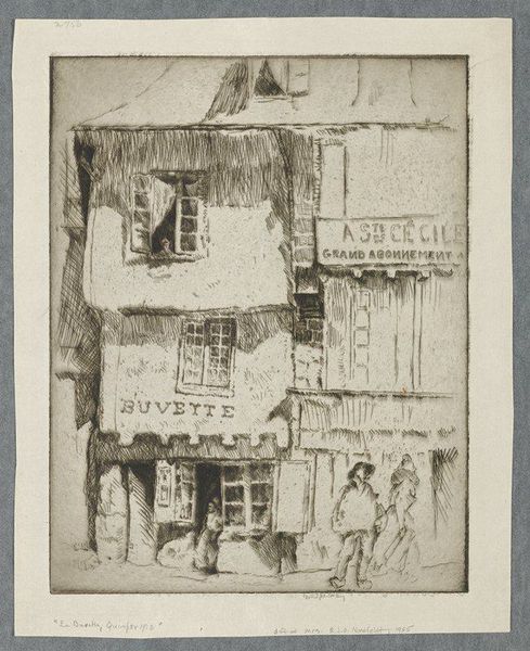 Curator: This is a "Sketch of exterior of a Tudor house" by Edwin Austin Abbey, likely completed en plein-air in 1892, utilizing watercolor and drawing techniques. Editor: The somber colors initially strike me. They evoke a stillness, like the house has silently witnessed generations pass. It feels quite melancholic, almost like a stage set waiting for a drama to unfold. Curator: The architectural elements, particularly the Tudor style with its exposed timber framing, are steeped in historical significance. These homes were often expressions of wealth and status, so their repeated depiction signals prevailing hierarchies. What social dynamics might these spaces have facilitated in the late 19th century? Editor: Symbolically, Tudor architecture has often been used to convey notions of "Englishness", even nationalism. Perhaps Abbey is evoking ideas of history, stability, and tradition. It could be read as commentary on how societal structures reinforce certain identities, even as society evolves. Curator: The muted, earthy tones—that aged paper quality—could indicate a reverence for history or maybe suggest decay and decline. Consider, also, the lack of human presence. Who inhabited such houses and who might be excluded from their walls? This era experienced great disparity. Editor: Visually, the grid-like patterns in the windows echo the timber frame's structure. Grids appear often across cultures—they signify order and containment, or conversely, entrapment. The artist doesn’t shy away from realism, but that stark simplicity leaves room for us to layer our interpretations on top. Curator: Yes, and the loose, sketchy quality lends itself to speculation. The house seems almost unfinished, perhaps alluding to the incomplete nature of history itself. Social progress demands interrogation and deconstruction. This architectural choice reflects these cultural shifts, wouldn’t you say? Editor: Absolutely. Revisiting structures from the past and making these stories anew means something different depending on where we are and what the world looks like around us. Looking closer at "Sketch of exterior of a Tudor house", it asks viewers to revisit themes in their present.