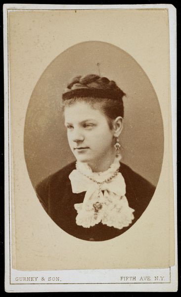 Curator: The delicate portrait before us is a gelatin silver print dating from somewhere between 1865 and 1890. The artist is Georges Penabert, and we know this piece as "Portret van een onbekende vrouw met omslagdoek"—or, Portrait of an Unknown Woman with Shawl. Editor: Immediately, what strikes me is a wistful elegance. The sepia tone lends such warmth, while the oval framing softens her gaze. You could almost feel as if you've stepped into an intimate parlor, a private moment suspended in time. Curator: It's so fascinating how these studio portraits became accessible during that era, offering individuals a relatively affordable way to preserve their likeness, even across generations. She is draped in what appears to be a richly patterned shawl... probably her finest. Editor: Shawls weren’t merely practical; they signified social standing and identity. The patterns, the fabric… even the way it's draped speaks volumes. I sense she wants to convey sophistication. What's unspoken perhaps is just as telling as her expression. It would be curious to explore who this woman wanted to project for future generations and what stories are suggested from how she presents herself. Curator: You’re right. Look at the intricate detail achieved with this early photographic process—every fold, every curl carefully rendered. One can easily romanticize, imagining secrets whispered through the shawl’s very fibers! But Penabert was probably a skillful portraitist in tune with the times. The slight tilt of her head adds a certain intimacy; she is revealing, but cautious. Editor: Exactly! The composition itself, from a symbolic point of view, becomes a carefully crafted message about respectability and quiet beauty. Although many view her simply as a ‘subject’, it's difficult to view her without asking questions like “What did her jewelry mean to her?” or "What were the thoughts she carried as the picture was taken?” Her presence becomes alive when considering her existence, not just appreciating a photograph. Curator: She invites so much imagination, truly. Editor: She does, indeed! The image creates this fascinating doorway to contemplate her world, even though many facets about her are obscured from our immediate view. I think she offers viewers like myself a lot to imagine beyond what’s on the photograph's surface.