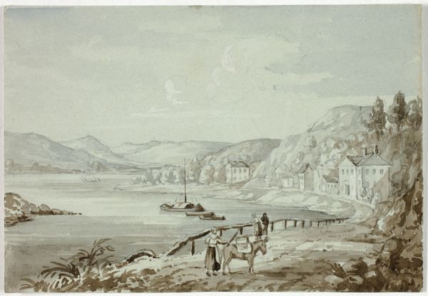 Curator: Standing before us is “Val of Shanganagh, Killiney,” created by an unknown artist in 1843. This captivating work, currently residing at The Art Institute of Chicago, employs gouache and watercolor on paper to portray a serene landscape. What strikes you first about this vista? Editor: The tonality. There is an overwhelming feeling of gentleness—a harmonious blend of muted blues, greens, and earthy tones. The composition, although seemingly simple, subtly leads the eye toward the distant hills. Curator: Indeed, it embodies the spirit of Romanticism, reflecting an appreciation for nature's sublimity. The depiction of Killiney Bay evokes a sense of awe. Observe how the tiny figures add a touch of the everyday against the backdrop of untamed beauty. Editor: I find the inclusion of the figures intriguing. Notice their diminutive size—are they symbolic representations of humankind's relationship to the vast landscape or more about the contrast between ephemeral life and permanent landscape? The texture created by layering watercolour and gouache also subtly emphasises depth. Curator: They might echo a certain visual language from Chinese paintings of that era, a cultural reference perhaps for reflection on self-discovery and one’s relationship with their culture, even nature. And these two figures seemingly represent an ancestral longing. Editor: Possibly. I am drawn to the foreground— the rugged coastline juxtaposed with the calm bay presents an interesting contrast. It's a balanced play of textures. Curator: Look closely at the sky; it reminds me of melancholy dreams. The diffused light and subtle gradations create an almost ethereal atmosphere, intensifying the feeling of stillness and reverie. One can almost hear the ocean lapping softly against the shore. Editor: Agreed. While the romantic style certainly emphasises these atmospheric qualities, I find it well crafted. I appreciate the artist's deliberate execution, particularly in rendering the play of light on the water. It gives life to the image and it enhances the subtle colour transitions within the rocks themselves. Curator: It's thought-provoking how such delicate application of mediums—gouache, watercolor, on paper— can evoke the immensity and permanence of our inner feelings. And whether you see romantic landscapes or cultural continuity reflected, art speaks when our soul truly listens. Editor: Very true! It demonstrates the capacity to evoke deeply resonant emotions, despite being composed with restrained formalism.