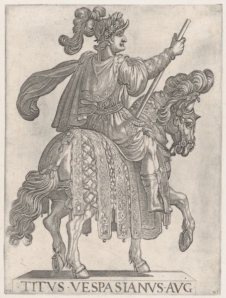 Laurens Eillarts created this engraving, "Equestrian Portrait of Emperor Titus," the dimensions of which are 307 mm in height and 211 mm in width. The equestrian portrait was a popular way to depict power and authority, particularly for rulers and military leaders. This imagery evolved from classical antiquity and was revived during the Renaissance, becoming a prominent symbol of leadership and control. It reflects the socio-political dynamics of the time, where the ability to command, both on and off the battlefield, was highly valued. In this engraving, we see not only the physical portrayal of Titus, but also the symbolic weight of his position. The horse, meticulously adorned, mirrors Titus's own regalia, reinforcing the themes of dominance and status. The deliberate rendering of textures and patterns serves to amplify the grandeur and importance of the subject. The contrast between the static, posed figure and the implied motion of the horse creates a dynamic tension. This is a calculated statement about power, leadership, and the cultural values attached to those roles.