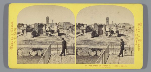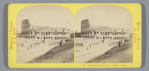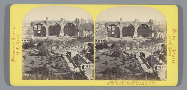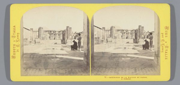 Editor: This gelatin-silver print, "Boog van Tiberius op het Forum van Pompeï," taken by Ernest Eléonor Pierre Lamy between 1861 and 1878, presents a view of the ruins. I'm immediately struck by the geometry of the composition; the way the paving stones lead the eye towards the archway is quite powerful. How do you interpret this work? Curator: The success of this piece rests heavily on its arrangement of forms. Note how the photographer uses a stereoscopic view to enhance depth. The contrasting textures – the rough stonework versus the relatively smooth walkway – create a visually stimulating surface. Editor: That's interesting. I hadn't considered the texture. Does the light also play a role? Curator: Certainly. The even lighting, almost devoid of dramatic shadows, allows for a uniform study of the architecture. Light isn't used here to create drama, but to reveal the intrinsic form. Look closely at the columns; the details of their fluting are meticulously captured. Editor: So, it’s less about the specific subject matter and more about how the photograph is constructed? Curator: Precisely. It is a system of lines, shapes, and tones organized to create an image of balance and order. Semiotically, each element refers back to the architectural structure itself. Editor: I see! The focus is on the architectural elements themselves. I hadn't considered analyzing it that way. Curator: Considering its aesthetic design reveals far more. Editor: It’s given me a whole new perspective. I’ll definitely be paying more attention to formal elements from now on.
