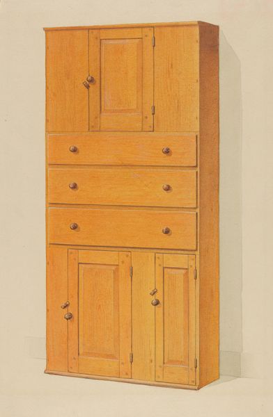 Editor: Here we have George Fairbanks' "Corner Cupboard," dating from around 1937, a drawing rendered on paper. The object depicted feels so familiar, and evokes a sense of warmth and domesticity. What symbolic meaning or visual history might be embedded in such an everyday object? Curator: The corner cupboard speaks volumes about our relationship with the domestic sphere. Placed in the corner, it transforms and softens the sharpest angles of a room. Its presence represents not just storage, but containment of cherished objects and memories. Notice how the glass doors of the upper cabinet subtly invite the viewer to wonder and imagine, like a curated personal museum. Editor: That makes me think of a reliquary, something sacred displayed for reverence. Curator: Exactly. The objects displayed inside are stand-ins for stories. Consider the act of placing and arranging. What psychological value does that hold? It's like a personal narrative is physically crafted. The wood itself speaks of rootedness and tradition; how it is depicted creates another layer of information. Fairbanks’ treatment hints at age and veneration. Editor: I see what you mean. It's less about function and more about this sort of cultural storytelling. The cupboard becomes almost like a family crest, representing their history, identity and legacy. Curator: Precisely. Each family will bring with it, its own symbols and stories, represented and performed again and again. That object quietly broadcasts a narrative of family and home to everyone who sees it. Editor: This really changes how I think about everyday objects. Thanks for opening my eyes! Curator: My pleasure! Seeing the emotional depth embedded in our environment, enriching both perception and appreciation for design.
