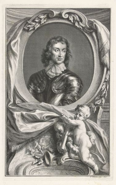 Editor: This is Jacobus Houbraken's portrait of Lieutenant General John Lambert. I find the intricate details in the engraving quite captivating. What compositional elements stand out to you? Curator: The visual impact relies heavily on the interplay between the textures. Observe how the artist juxtaposes the smoothness of Lambert's face with the detailed armor and the flowing drapery. The oval frame enhances this contrast. Editor: I see what you mean. It is not just about the person depicted, but the way the artist uses line and form. Curator: Precisely. Notice also the strategic use of light and shadow to define the forms, creating a sense of depth and volume. It transcends mere representation, doesn't it? Editor: It does. I initially focused on the subject, but now appreciate how the artistic choices shape the overall impression.