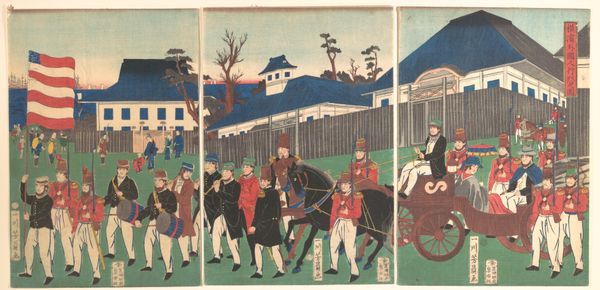 Editor: This triptych, "Procession of People from Five Countries," was created in 1861 by Utagawa Sadahide. It’s a woodblock print depicting, well, processions of people. What immediately strikes me is the almost staged presentation of these different nationalities. What’s your take on this work? Curator: What interests me is situating this image within the complex political landscape of mid-19th century Japan. This was a time of forced opening to the West, ending centuries of self-imposed isolation. So, these meticulously rendered processions aren't merely ethnographic documents. They are deeply embedded in power dynamics, reflecting Japan's grappling with western influence. Editor: So, you're saying it's not just a snapshot, but a statement? How so? Curator: Consider the gaze implied by the artist. Who is this image for, and what does it mean to represent these foreign powers in this way? Are they being celebrated, scrutinized, perhaps even subtly critiqued through the artist's rendering and compositional choices? Look closely. How does Sadahide depict the individuals of each nation? What specific details does he emphasize or perhaps omit? What are the implications of presenting all these distinct groups side-by-side? Editor: I notice the almost cartoonish depiction, compared to what I understand about traditional Ukiyo-e prints. Almost like he is overemphasizing their “foreignness”. Curator: Exactly! And thinking about it as "history painting" opens the door to questioning which historical narrative is being constructed, and for whom. We must always consider that the artist has a specific intention when representing "the other." In essence, how does it reinforce or challenge the existing social structure? Editor: I see it now. It’s more than just documentation; it's about Japan defining itself in relation to the West during a pivotal historical moment. Thanks. Curator: Precisely. It invites us to reflect on how cultural exchange is rarely neutral and is frequently embedded in power dynamics.