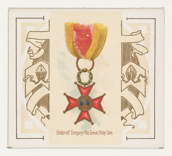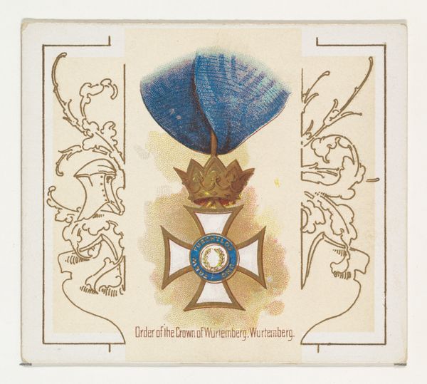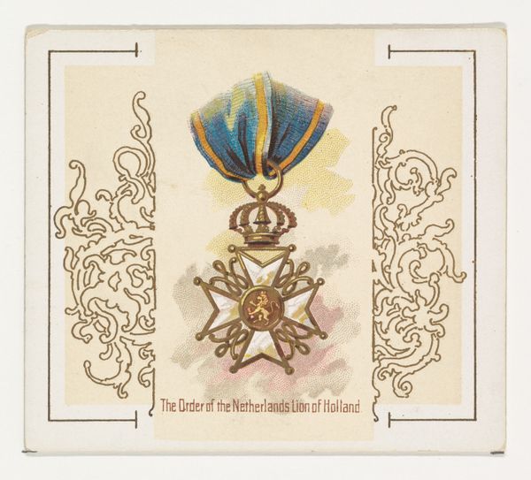 Curator: This is a print entitled "Military Order of William, Netherlands or Holland" from the World's Decorations series, created around 1890 by Allen & Ginter as part of a cigarette card set. It employs watercolor and print techniques, and it's currently housed at the Metropolitan Museum of Art. Editor: Oh, isn’t it sweet? A tiny badge of honour rendered with such delicate colors, it almost feels whimsical, even though it signifies something quite serious. There's something so gentle about it. Curator: It is a miniature celebration of craftsmanship embedded in everyday commerce, created at a time when such decorations held significant social currency. Think about it—a marker of social status tucked into a packet of cigarettes. Editor: And beautifully executed, nonetheless. The ribbon in particular – the artist has created folds and textures with simple watercolor strokes. The crown looks a bit heavy for that tiny sprig of laurel, doesn’t it? It’s kind of comical, actually. Curator: That contrast, I believe, underscores the manufacturing context. This piece circulated as a consumer object, blurring the boundaries between art, commerce, and patriotic imagery. Its artistic merit derives from how seamlessly those elements intertwine. The decorative border serves its function, too, since they knew it would be mass-produced. Editor: It makes me think about the ephemeral nature of glory. To go from an emblem of national pride to something disposable, a collectible trinket accompanying a smoke. It reminds me how reputations come and go! Curator: Precisely, its value rests on its material existence and broad circulation within the social landscape of the time, far beyond its intrinsic artistic features. Editor: That being said, I feel touched by its charm; it's oddly personal despite being mass produced and the message about the passage of time. A fleeting moment of valor, framed for the ages—or at least, for a cigarette break!