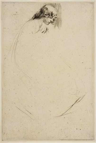 James Abbott McNeill Whistler created this intimate etching, titled "Jo's Bent Head", capturing a moment of quiet introspection. Whistler was deeply influenced by the aesthetic movement, which prioritized beauty and art for art’s sake, and sought to capture fleeting moments and emotions. This print depicts Joanna Hiffernan, Whistler’s muse, model, and mistress. She embodies the pre-Raphaelite ideal of beauty with her flowing hair and delicate features. The subdued pose and soft lines speak to the complexities of women's roles in the 19th century. While women were often idealized in art, their individual experiences and emotions were frequently overlooked. Whistler once said, "The picture is my protest against the commonplace". Here, Hiffernan’s downcast gaze evokes a sense of vulnerability, offering a counterpoint to the dominant narratives of female representation. The etching invites us to consider the inner lives and emotional depths of women beyond societal expectations. As we stand before "Jo's Bent Head," let’s reflect on how art can both shape and challenge our understanding of identity, gender, and the human experience.