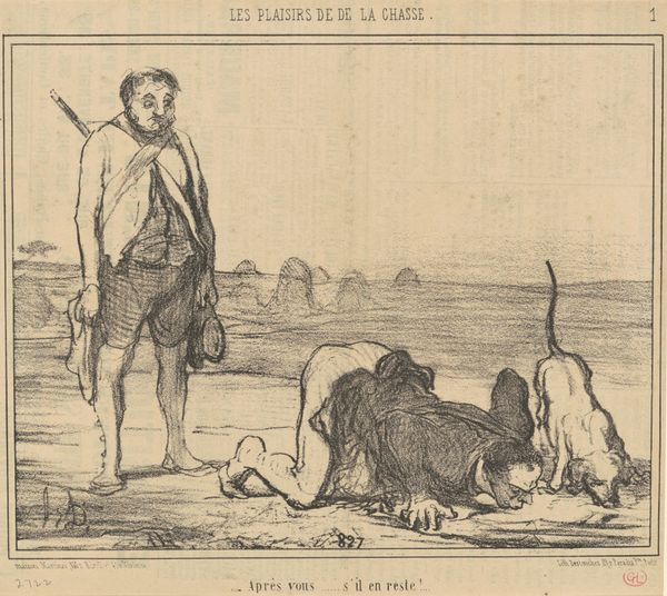 This print by Honoré Daumier captures a moment of dawning horror. The composition, with its stark lines and tonal contrasts, directs our eyes to the hunter, caught between two lions. The frenzied lines of his hair mirror the chaotic energy of his predicament. Daumier masterfully uses line and form to convey the scene’s narrative. The hunter, a Parisian out of his depth, embodies a destabilization of traditional power dynamics. He is no longer the dominant figure, but prey. The lions, rendered with loose, expressive strokes, symbolize nature's indifference to human hubris. Their looming presence challenges the hunter's presumed authority, suggesting a reversal of roles in the hunt. Ultimately, the print operates as a semiotic game, challenging fixed notions of dominance and control. Daumier's work exposes the fragility of human ambition when confronted by raw, untamed nature.