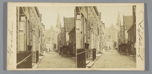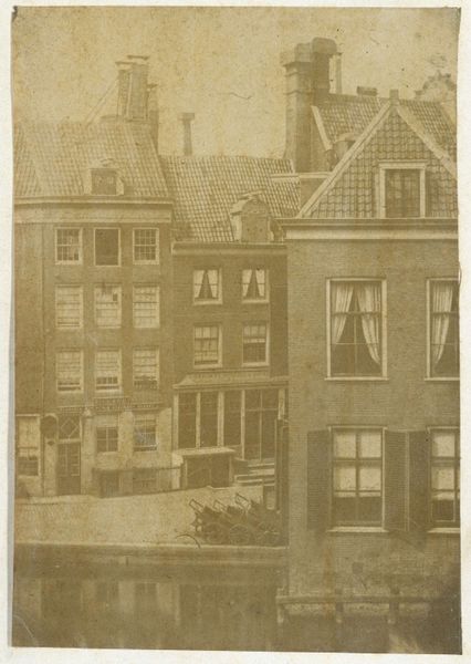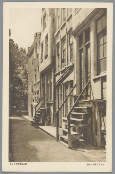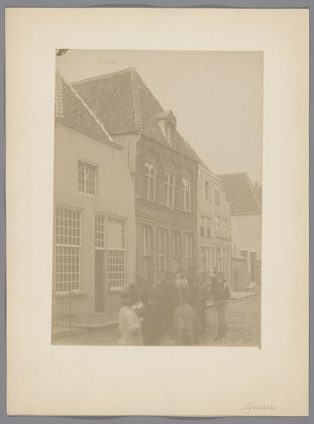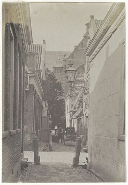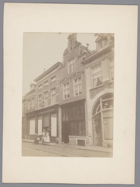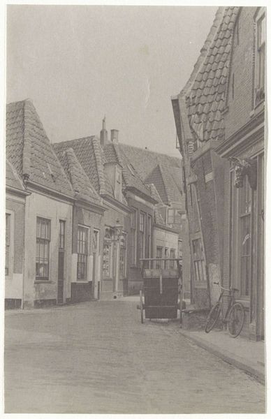Curator: This piece invites you into a moment seemingly frozen in time. The print, "Amsterdam. Driehoekstraat", most likely captured between 1875 and 1930, shows a slice of Amsterdam life, a narrow street scene. I find it quite magical, a visual poem whispering stories from a bygone era. Editor: I agree, there’s a certain stillness, almost melancholy, that settles over you when you look at it. It’s not just the sepia tones of this historical photography, but the deep shadows and the relatively empty street. It feels... expectant. Curator: Exactly! It makes you wonder about the lives lived in those buildings. Those step-like gables... they must have seen so much. The way the light falls, it almost turns the mundane into something quite... theatrical. The simplicity is astonishing! Editor: The photograph as evidence is interesting here, isn't it? Street photography serves as a powerful sociohistorical register, revealing clues about class, labor, gender. The figure barely visible on the stoop--is it a domestic worker? Curator: Perhaps. Or even someone nipping out for some air. I rather love that uncertainty, how this anonymous photographer captured these candid moments and let the light do its work. Think about the choices made about point of view. Editor: Yes, the viewpoint definitely shapes our experience of the scene. It isn't centered, but a little offset which gives it an almost intimate, voyeuristic feel. I also consider the tension implicit in whose stories are deemed photographable. Whose labor gets framed as worthy of documentation and preservation? Curator: True, a really beautiful consideration. It brings depth to my emotional reaction, the almost wistful air about the image... the very tangible absence. We are not *invited* in, so what does that speak to, as you mentioned, that selective framing? Editor: Exactly! It asks us to question the archive itself, to examine what perspectives and histories might be missing, while acknowledging this photographer’s composition. Ultimately this visual moment serves to trigger conversations about the narratives we inherit and whose memories they truly represent. Curator: Gosh. Well, I shall ponder it further, but thank you for guiding us into the work a little more deeply. It’s made me reflect upon the weight of history held within these apparently still streets. Editor: It’s a gift art gives us: to see the world, past and present, with a renewed sense of urgency and compassion. Thank you for joining me in thinking through this piece, and encouraging an alternative engagement with a photograph so quiet.