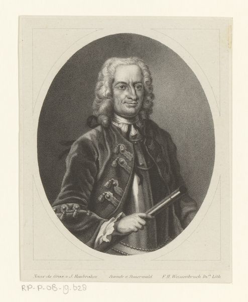 Editor: Here we have Pierre Michel Alix’s "Portret van Benjamin Franklin," created between 1793 and 1795. It looks like a print or engraving of a drawing. I’m struck by the almost photographic realism achieved with such delicate lines and shading. What elements stand out to you? Curator: Notice how the artist uses the oval frame to concentrate the viewer's eye on Franklin's face. The texture created through engraving is fascinating. Consider how line weights vary – thicker lines define the contour of the face and jacket, creating a sense of volume, whereas thinner, more delicate lines render the nuanced shadows and details of his aging skin. How do you think this use of line affects the overall composition? Editor: I see what you mean; the linework really emphasizes depth and form, giving the portrait a tangible, almost sculptural quality despite being a flat print. Do you see a message embedded in the composition? Curator: Let’s observe how the composition is constructed. The even lighting minimizes dramatic contrast, fostering an atmosphere of calm intellect. Alix invites us to read this composition in layers—texture, line, form, light. He wants the viewer to see beyond simple resemblance. In particular, consider how Franklin’s steady gaze directly engages the viewer, imbuing the piece with directness, authority. Are you picking up on any classical references through these elements? Editor: Yes! I noticed that despite being a realistic likeness, the soft, almost idealized presentation gives the work a neoclassical sensibility! It emphasizes reason and intellect above all. Curator: Precisely! Observing how these elements harmonize unlocks deeper appreciation. Editor: This close formal reading has really illuminated Alix's technical skill, but also the conceptual underpinnings of the work. Thank you!
