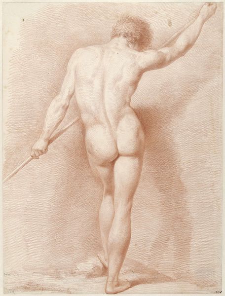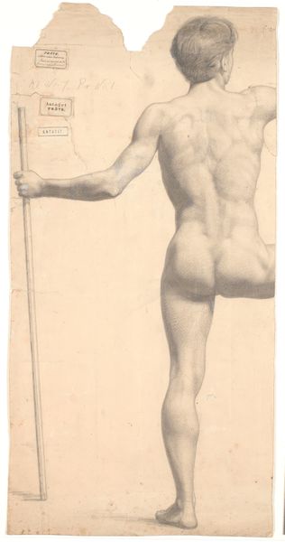 Editor: So, this is "Standing Male Nude, Seen from Behind," created around 1826 by A. Waterloo. It’s a charcoal and pencil drawing. I’m immediately struck by the intensity of the musculature; it feels almost sculptural. What's your take? Curator: The raw strength, right? I feel it too. Waterloo has rendered this figure with such tangible weight. I almost feel the pressure of those muscles on his skeleton! It reminds me of early anatomical studies, a kind of deep dive into understanding the body's architecture. Do you see how the light falls? Editor: Yes, it's interesting! It defines the form so meticulously, like a study. Curator: Exactly! Almost forensic. I find myself wondering what sort of character inhabits this body. Is he a worker? A gladiator? The drawing hints at something classical but remains so grounded in its realism. The tension in his back... is it exertion or defiance? Editor: Defiance, maybe? There's a latent power, even from this back view. It is as if he has seen a life, a burden. But I suppose that reading isn’t really supported by any background or setting? Curator: True. That’s my imagination wandering again. We only have the man himself. I’d love to know what Waterloo intended. Still, it's exciting when a piece lets you weave your own narrative. I now find myself making one up! Editor: I hadn't considered how the absence of context invites the viewer to fill in the gaps. That is, to a certain degree, inspiring. Thank you. Curator: My pleasure. Art that stays with you, nudges you, invites curiosity…that's what I'm living for!