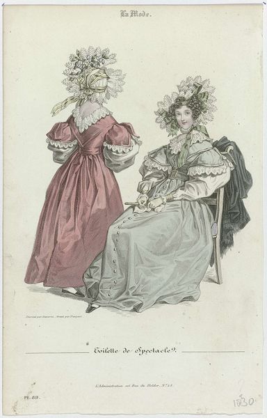 Editor: This print, titled "La Mode, 18 août 1832," by August Delvaux, depicts two women in fashionable dresses of the time. It’s a lovely watercolour illustration, but I'm particularly struck by how much material goes into these sleeves and the almost industrial nature of the embellishments. What does it bring to mind for you? Curator: This image is a powerful document of textile production and consumption in the 19th century. It’s easy to focus on the elegance, but consider the labor involved: from the raw materials like the cotton muslin mentioned in the caption, to the spinning, weaving, and embroidery. Notice how the prints themselves mimic textures, adding to the impression of opulence. Editor: So you’re saying the image itself is connected to production in some ways? Curator: Exactly. Prints like these drove desire and ultimately, demand for these textiles. These images, though seemingly passive fashion plates, participated directly in the economic engines driving textile production. Editor: I hadn’t considered the print as part of that cycle. The amount of trimming on these gowns… did that imply something specific about status and wealth at the time? Curator: Definitely. But think beyond simple ostentation. The layers, the trimmings – each represent the investment of labor and capital, solidifying social standing through conspicuous consumption. And how do you think this kind of imagery impacted gender roles and expectations around fashion? Editor: I suppose it reinforced them, positioning women as both the consumers and the spectacle of fashion. It really makes you think about the supply chain, even then. Curator: Precisely. Understanding the materiality and means of production provides critical insights into the social and economic structures of the period. Next time you view it, reflect on this interplay of creation and consumption.