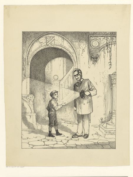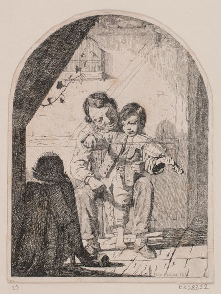 Editor: This is Otto Haslund’s "The Boy Learns to Play the Violin," an etching from 1865. It’s a pretty intimate scene. There’s a sense of instruction, but also perhaps constraint? It feels very domestic, but not necessarily comfortable. What social narratives do you see embedded in this image? Curator: Well, immediately I’m drawn to the composition and how it situates us, the viewers. We are peering into a scene that seems staged but aims for an unscripted reality. Notice how the artist places the shadowed figure to the left. The figure almost serves as a visual barrier or observer to what is happening, perhaps emphasizing social exclusion, poverty, or simply another unseen player in the spectacle. Does that add a layer to the "constraint" you perceived? Editor: Definitely. And the presence of the birdcage hanging above seems to be accentuating a sense of entrapment. This evokes class differences too. Who is allowed to learn music, who gets to listen, and who is completely outside the experience? Curator: Exactly! The scene underscores how access to art, even at the level of learning, becomes a symbol of social mobility and aspiration. It implicitly asks: who has the privilege to pursue leisure and refinement? Look at the etching itself; it is a relatively inexpensive process. The print makes art and this message accessible to a wide audience. Editor: That's fascinating, thinking about the *politics* of access, not just the picture itself. I was only focused on the narrative elements, but now I see how even the medium contributes to the broader social statement. Curator: Indeed, it reminds us that art always exists within – and comments on – a larger network of cultural values and power dynamics. Even a seemingly simple genre scene like this has multiple layers to unpack. Editor: I never would have thought of the medium itself carrying meaning like that! It's shifted my perception completely. Curator: Excellent. Hopefully, the piece and this conversation underscore how studying social narratives within art enriches our viewing experience and sharpens our socio-historical awareness.