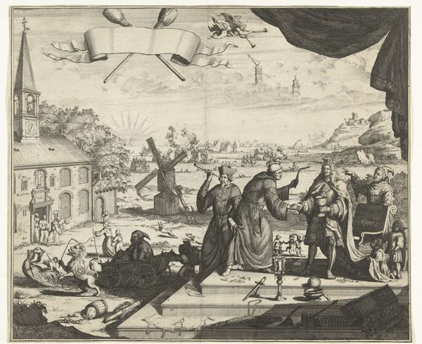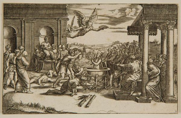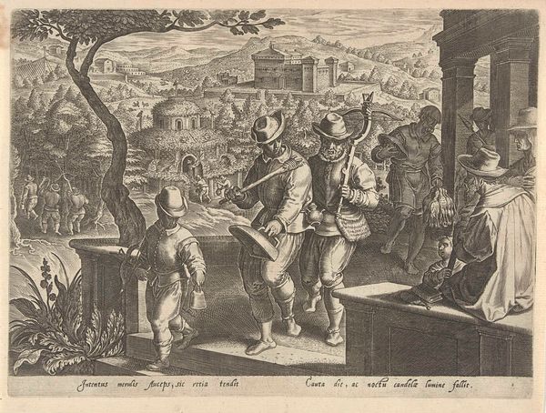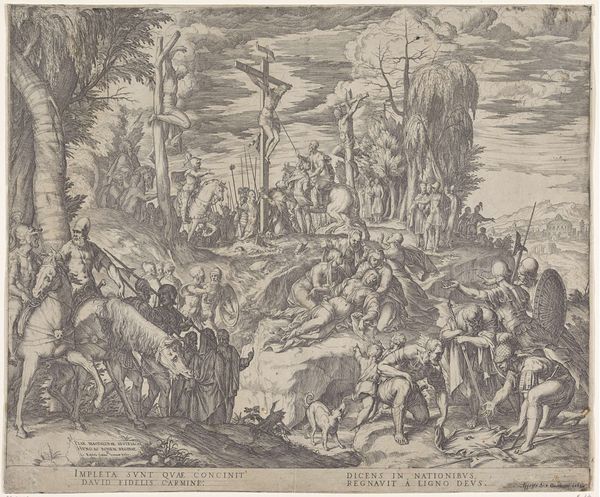 Curator: Here we have Dirck Volckertsz Coornhert's "Flight into Egypt", created sometime between 1547 and 1551. The medium is ink on paper. Editor: It strikes me immediately how densely packed the composition is, almost claustrophobic despite depicting a journey through open land. Curator: Yes, observe how Coornhert masterfully uses cross-hatching and varied line weights to generate depth and shadow within this scene. The landscape almost overwhelms the figures. Semiotically, this reflects the immense burden and uncertainty inherent in their flight. Editor: And note the laborious method of engraving itself. This wasn’t quickly dashed off. It demanded immense skill, time, and access to very specific tools and training. Consider the economic and social strata involved in the very making of this image. The material cost of production likely determined the limited audience that first engaged with this work. Curator: The central narrative—the holy family's escape from Herod's persecution—gains symbolic resonance through Coornhert's landscape choices. We see both remnants of classical antiquity crumbling beside them as well as a nature filled with hazards, which underscore the impermanence of worldly power compared to divine destiny. Editor: Right, and let’s consider what engravers like Coornhert did. They were craftsman reproducing, disseminating ideas—essentially part of an early information industry. Who was employing them? Who commissioned these biblical scenes? What function did they serve beyond pure aesthetics for the rising merchant class that fueled artistic creation in that era? Curator: While the social context is important, analyzing the image on its own terms demonstrates an accomplished employment of perspective and an interesting combination of realistic figures set within an idealised landscape. Editor: The etching itself—the deliberate labor involved in its material construction—is itself testament to the changing modes of artistic production in the mid-16th century. Curator: Well, I believe our conversation brings fresh awareness to the detailed interplay between line, form and, by extension, meaning, displayed in this exquisite drawing. Editor: I would add that exploring the processes and materials through which prints were created is key to truly comprehend the art market and circulation of images during the Reformation.