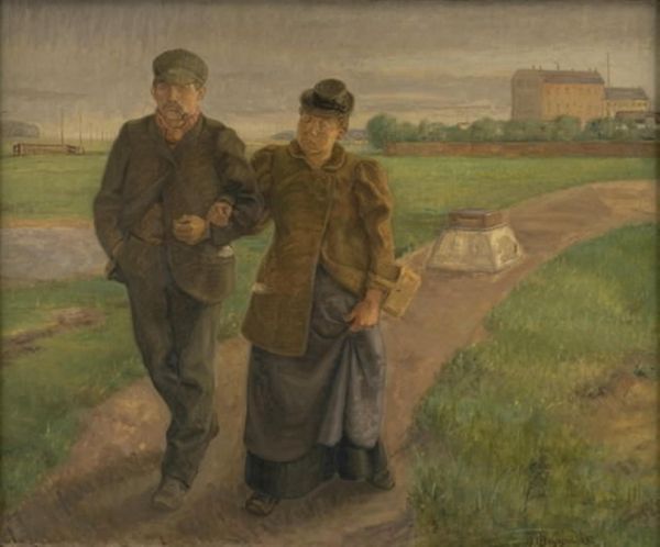 Curator: Here we have Niels Bjerre’s 1906 painting, "People outside a Church, Harboøre, Jutland," an oil on canvas now held in the collection of the Statens Museum for Kunst. Editor: The immediate impression is somber. The palette is muted, nearly monochromatic, reinforcing the subdued atmosphere. It almost feels like a photograph, a candid snapshot capturing a hushed moment in time. Curator: Observe how Bjerre arranges the figures. We have a cluster near the church door, one figure stepping inside, then the standing group in the center, echoed by figures near the water and sky, establishing a deliberate sequence from sacred space to secular landscape. Note also the careful distribution of light and dark that creates visual balance, and the flattening effect in the picture plane; it’s deceptively simple, no? Editor: Not so simple at all, as those dark figures against the horizon line are profoundly symbolic. Black has always been the color of mourning, loss, and transition. Seeing these figures juxtaposed against the liminal space of the coastal horizon seems to signify both an ending, and a movement into an uncertain future. Also, note the way these clusters mirror the small crosses placed in the burial ground; mortality and belief are clearly central themes. Curator: And there's a very precise articulation of form throughout, a controlled handling of the medium to guide the viewer's eye. Take the lines of the architecture that leads your vision diagonally towards that cluster on the horizon, or the subtle tonal gradations which lend volume without overly modeling the figures or land. Bjerre’s interest appears to be in distillation and reduction. Editor: These figures represent the people of this Danish fishing village, these were a hard people enduring life's realities in their landscape. The symbols resonate across generations, informing our collective memory and inviting reflection on mortality, community, and the relationship between landscape and the self. The stark setting reminds us of humanity's enduring relationship with faith and the elements. Curator: Ultimately, this piece reveals Bjerre’s sophisticated compositional choices and his interest in pictorial balance. Editor: I'll leave here considering what connects the cycles of the sea with the traditions of faith and burial so powerfully.