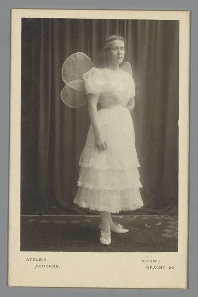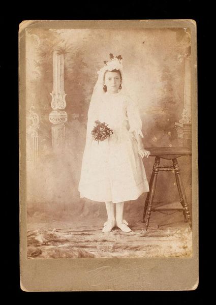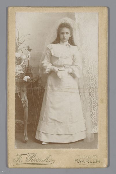 Editor: This gelatin silver print, “Portret van een onbekende communicant achter een bidstoel,” by Photo Compagnie Belge, dates from around 1880-1910. The girl's expression feels so serious, almost burdened. What do you see in this image, especially considering the symbols of communion? Curator: It’s fascinating how a seemingly simple portrait carries so much symbolic weight, isn’t it? Notice the bidstoel, the prayer stand, adorned with a dark, ornate cross. The cross within the rectangle. It isn't just a symbol of faith, but almost of constraint. Editor: Constraint? Curator: Consider what the act of communion means. It’s about spiritual cleansing, becoming pure. Do you see a connection to the girl's dress? The clothing signifies religious purity and a visual expression of social and cultural expectations for young women at the time. Her gaze lacks youthful exuberance. Editor: So the photograph captures more than just a religious rite; it reflects societal pressures? Curator: Precisely! These images reinforced ideas about innocence, duty, and the role of young girls within the community. Look closely at the dark color of the wood; notice her solemn pose. Do those evoke a sense of joy, or something else? Editor: More like quiet acceptance, I think. It makes you wonder about her personal feelings that day. It also makes you wonder about the relationship to the camera. Curator: A compelling reflection on cultural memory. Perhaps this image serves as a potent symbol of transition, innocence, and faith for young women through visual symbols. Editor: I hadn't thought about it that way before, but now I see it too. The symbolic significance in such an old portrait!