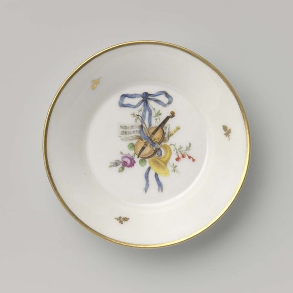 Editor: We're looking at a soup plate made around 1805 by Dihl et Guérard, crafted from ceramic and porcelain. The decoration around the edge is what grabs me – there’s a mix of classical figures and what look like military trophies. What kind of message was this plate intended to send? Curator: Precisely! Luxury porcelain during this period, especially pieces like this originating from France, were powerful signifiers. They were very much involved in constructing and broadcasting an image of power. The figures, rendered in muted tones against the opulent gold, are drawn from a classical past, intended to legitimize the present. Editor: So the military trophies signal contemporary power? Curator: Yes, think about the context: Napoleon was consolidating his power and influence across Europe. Luxury goods displayed wealth and taste, but they were also important tools in building cultural capital and solidifying political power. Editor: So, eating your soup off this plate becomes a kind of political statement? Curator: In a way, yes. Consider who would have owned and used this plate. They weren't merely consuming food; they were participating in a visual culture steeped in political messaging. Each element, from the porcelain itself to the imagery, spoke volumes. Editor: It’s interesting how the object itself becomes a stage for political messaging and cultural identity. I'd never thought about dinnerware having this level of influence! Curator: And that influence extended beyond just those using it, but to those who saw and admired it as well, thereby becoming a conversation starter on status, style, and power in early 19th-century society.