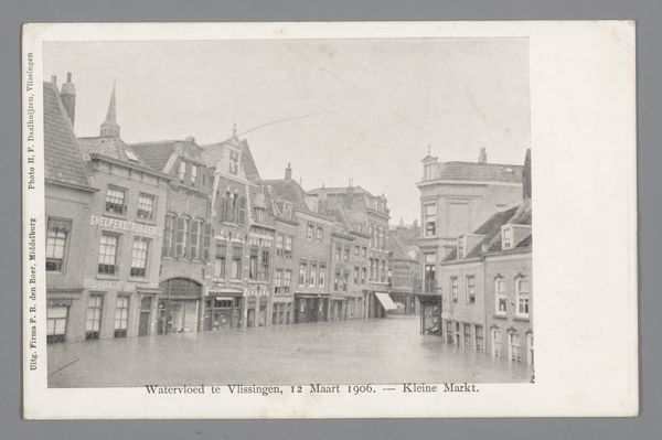 Curator: Let’s take a look at “Gezicht op Meppel, Drenthe,” a photograph printed before 1915, likely a landscape piece documenting a moment in the life of Meppel. Editor: It's strikingly serene. The stillness of the water reflecting those quaint buildings… It feels almost too idyllic. There’s a definite constructed beauty to the scene, especially how the buildings seem to almost line up on top of each other to look over the water. Curator: I see your point about its almost staged appearance. The presence of figures by the water also makes the scene seem very deliberately put together, with each element adding another layer of narrative complexity. Perhaps these kinds of early landscape photos were as much about idealising a vision as documenting it. Editor: Absolutely. And how does this romanticized depiction potentially gloss over the socio-economic realities of early 20th-century Meppel? The picturesque obscures any potential hardships, focusing solely on the aesthetic appeal of the cityscape. Who benefits from these pictures? What are they meant to do? Are they postcards? Advertising pamphlets? Curator: Excellent questions! Thinking about the probable social functions of an image like this helps put it in context. It does evoke a feeling of quaint comfort; this photo probably played a role in selling Meppel as a tranquil place. In that regard, these pictures also speak of the socio-political dimensions of representing the city. Editor: Precisely. So much about what is shown–or not shown. The waterways likely played a key role in commerce and transportation. Do we see anyone at work? Are we encouraged to think about labor here, or consumption? The scale, I imagine, makes this photo accessible. What class of person is buying and disseminating this image? Curator: Those questions regarding its accessibility lead back to considering what sorts of people had access to cameras and photography printing tech at this time. Were people being included and, equally as important, excluded, in those processes? Thinking this way can illuminate our broader socio-historical context surrounding visual mediums. Editor: This image might, at first glance, appear simple, but as we see, even something this seemingly straightforward has multiple layers. Images like this become tools of historical examination themselves. Curator: A very insightful way to reflect upon how we read these types of documents! It demonstrates the multifaceted way an image of such a scene as this can serve to promote local appeal while prompting questions regarding that period's socio-political dimensions and its implications for us today.